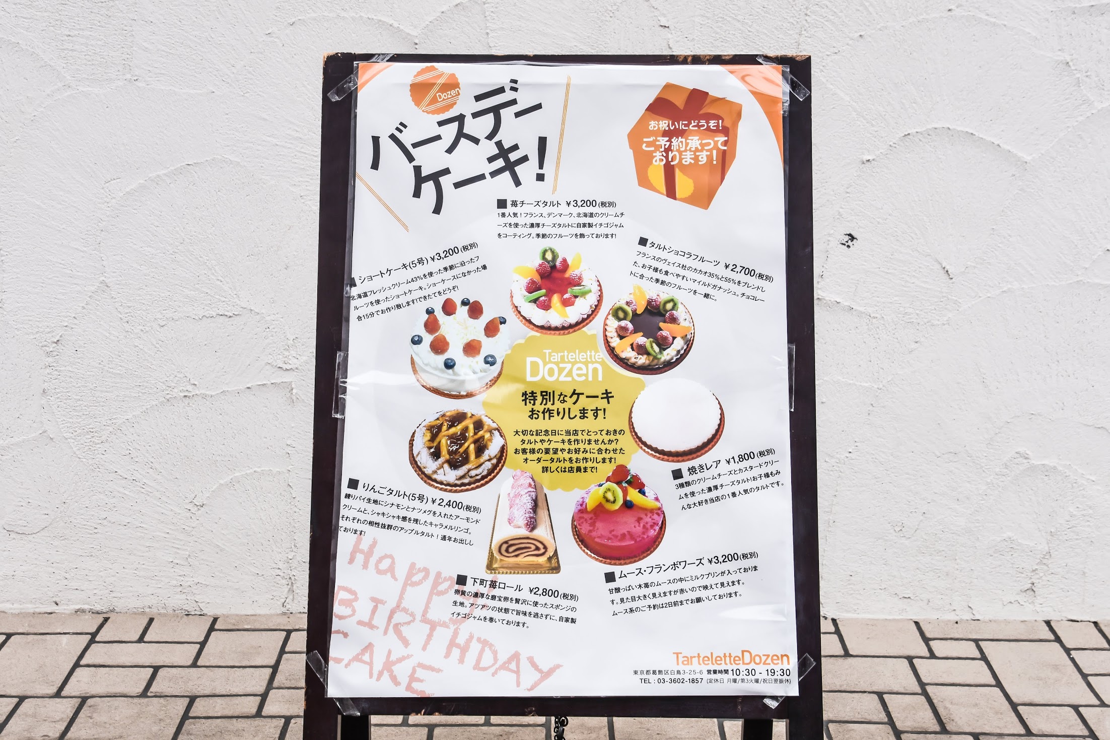 Tartelette Dozenではバースデーケーキの予約ができる他、オーダーメードでケーキを作る事が可能です。メニューとして定番化されている商品は全7種類。どれもクオリティの高い商品となっています。