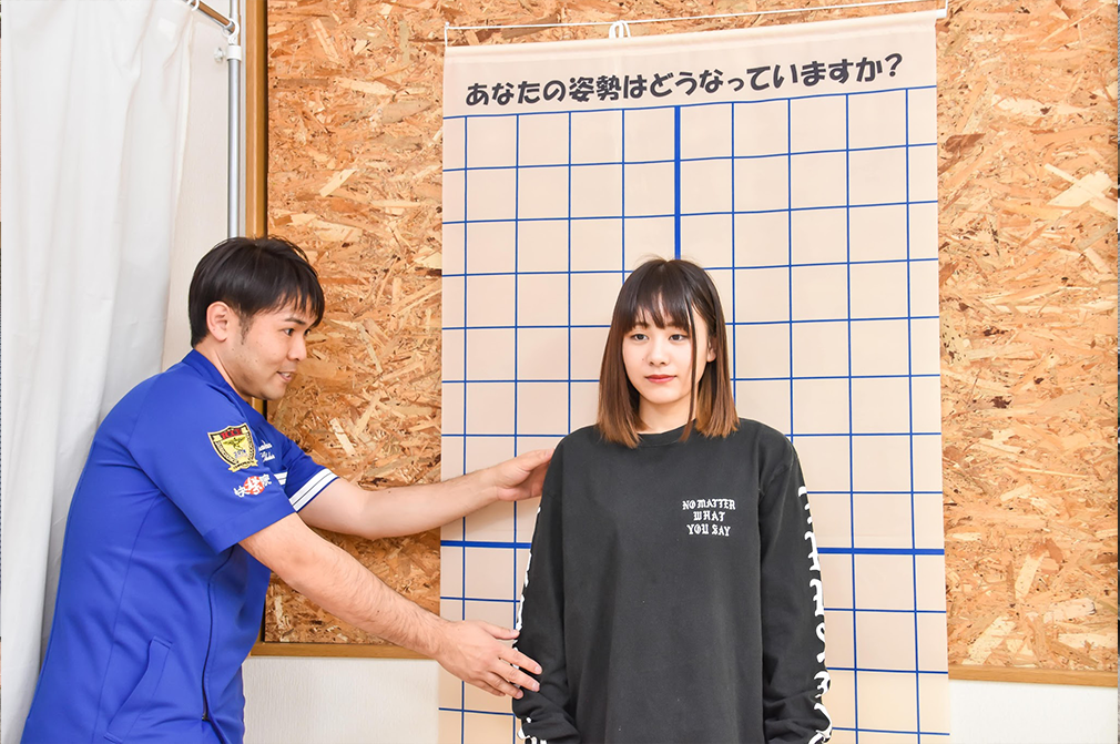 骨格の歪み、可動の範囲、関節の動きや筋肉のハリ、その原因を見つけるために、姿勢・脊椎・骨盤の歪みを確認します。