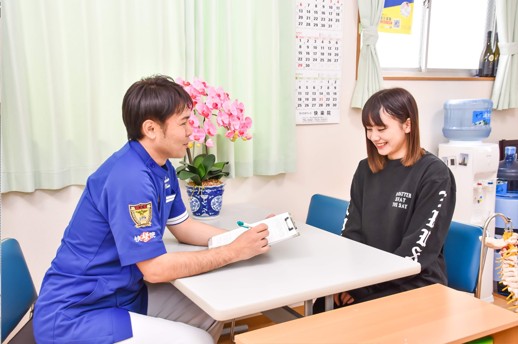 少しでも不安を取り除くためにカイロオフィス快楽院では施術前にしっかりとした説明から入ります。現在の体の状態や痛み、どこが原因で痛みがきているのか、どのように施術を行っていくのか、図や模型などを利用して丁寧に説明。その後実際にからだの歪み具合を施術を行います。施術後の状態を確認し、再発しないためのhow-toをアドバイスします。