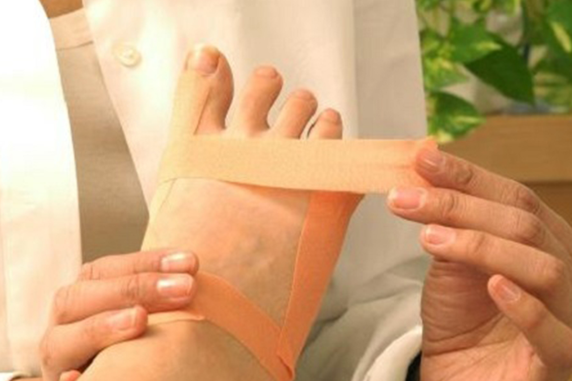 そこで、『いずみ式フスフレーゲ』では角質ケア・魚の目除去・巻き爪補正等のサポートを行いつつ、アーチを整える為テーピングを行い、さらには山道先生独自で開発され、特許出願中の横アーチパットやインソール、靴までを提案するのです。
