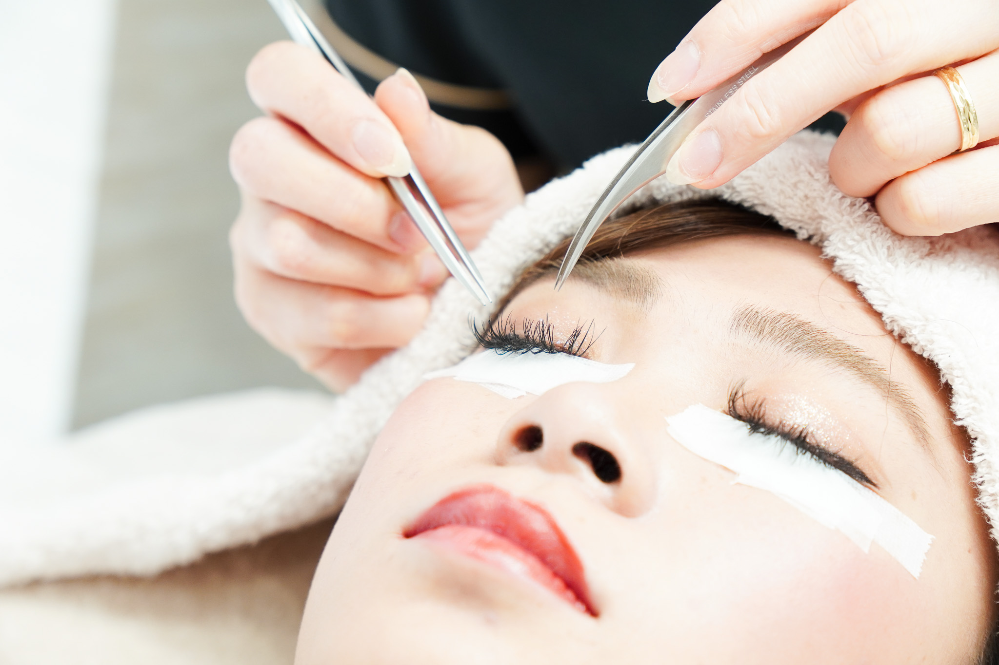 『Beauty Salon Nine』では「ボリュームラッシュ」と呼ばれるエクステを使用。細い毛を3束から5束ほど、1本の自まつげに装着していきます。
